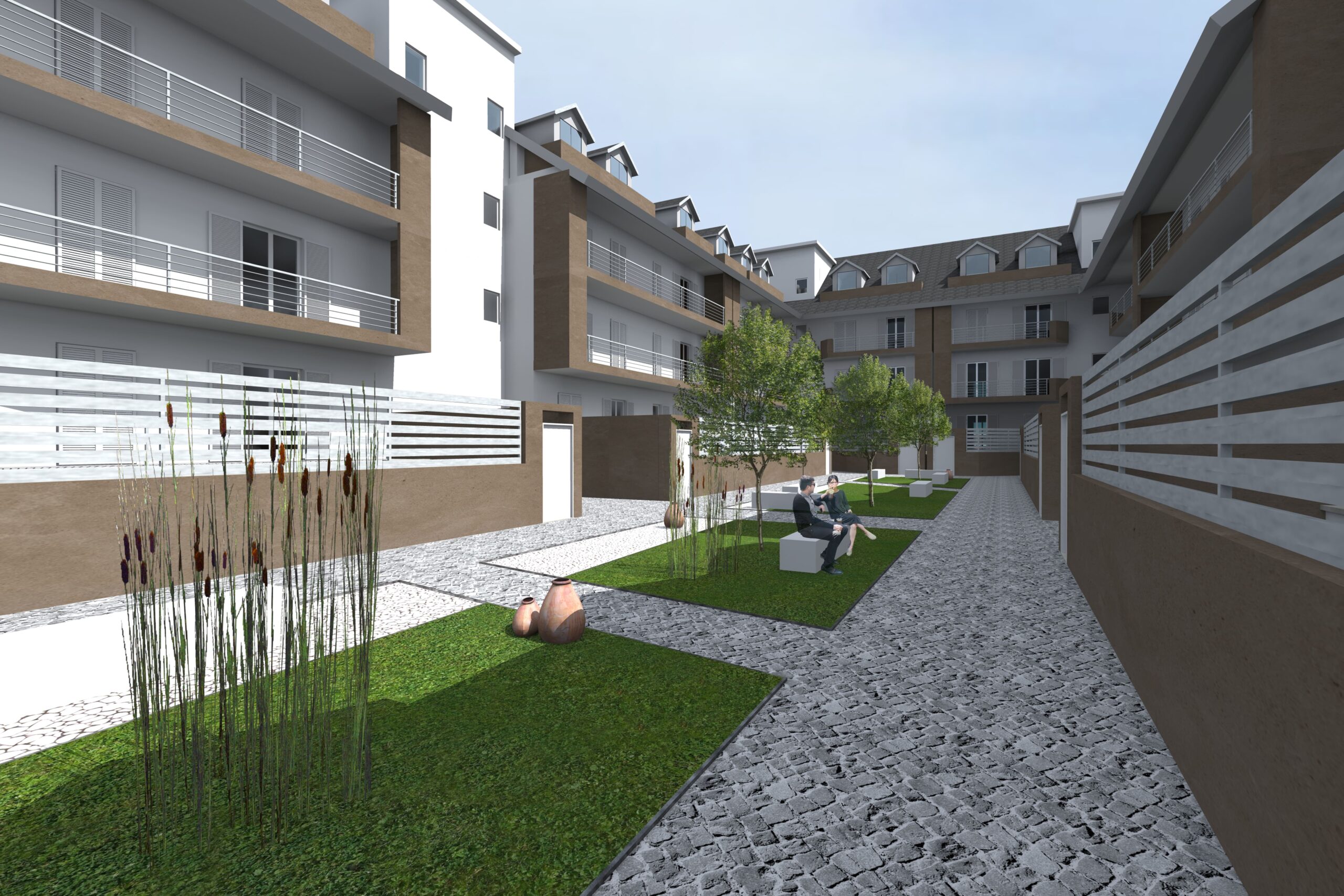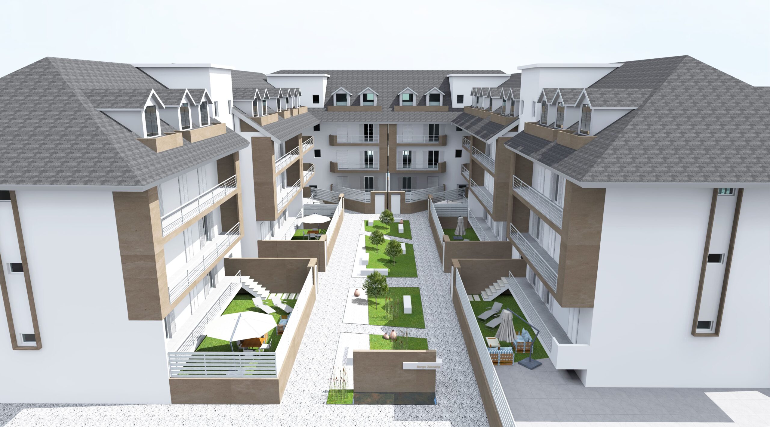 Il complesso immobiliare si sviluppa su un lotto di circa 6.000 mq, con una struttura architettonica a “U” distribuita su 4 livelli per una superficie coperta di circa 1.200 mq. Al centro è stata realizzata una piazza comune pensata come spazio di socializzazione e co-housing.